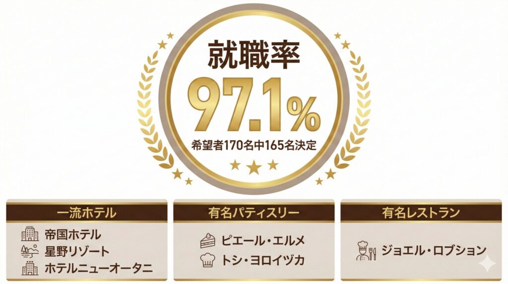 - 帝国ホテル、ピエール・エルメなど一流企業への就職実績