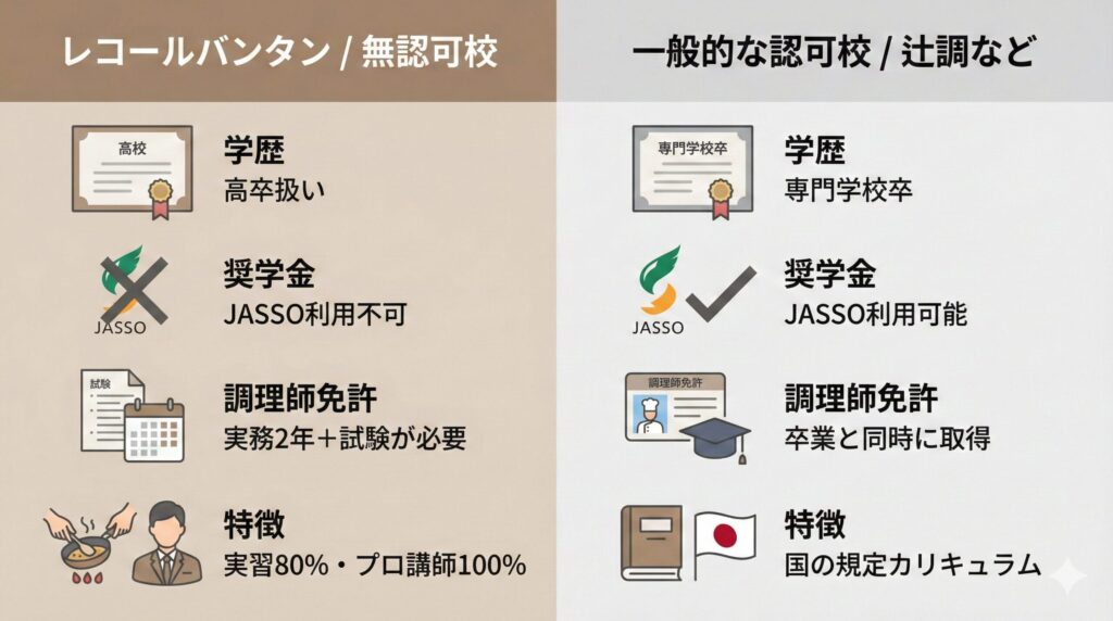 | 項目 | 認可校(辻調・服部など) | レコールバンタン |