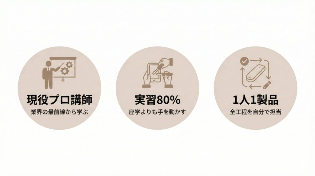 全授業の80%以上が実習なので、卒業時点での技術レベルが高いと評価されています。「1人1製品」方式で全工程を経験しているため、即戦力として期待できます。 - 業界とのネットワーク