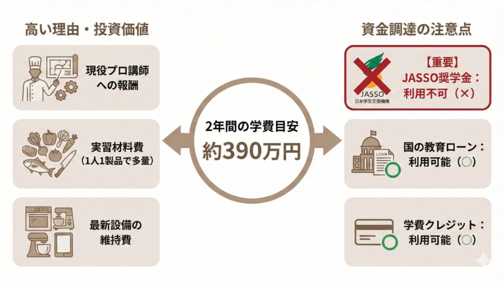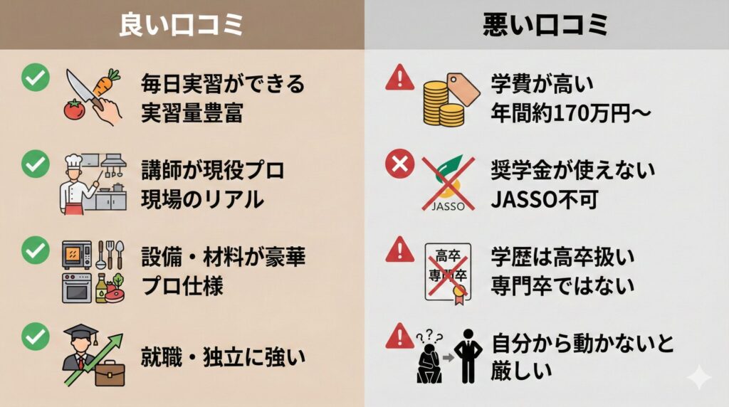 JASSO奨学金が使えない 卒業しても学歴は高卒扱い 調理師免許は実務2年+試験が必要 通学定期の学割が効かない |