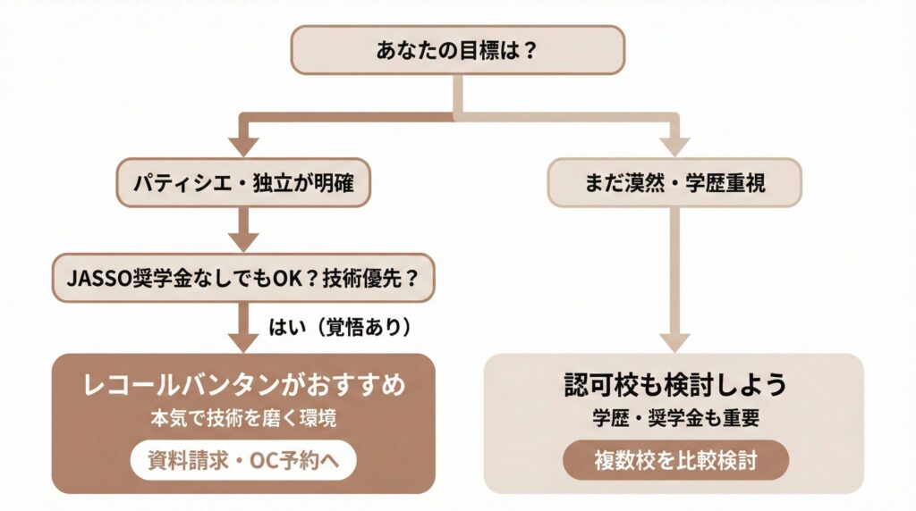 結論から言うと、レコールバンタンは「パティシエ・シェフ・バリスタになりたい」という明確な目標を持つ人には、おすすめできる学校です。ただし、無認可校であることのデメリットを理解した上で選ぶ必要があります。