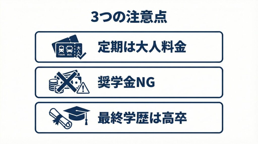 この表の中で特に保護者の方が注意すべき点は、通学定期と奨学金です。