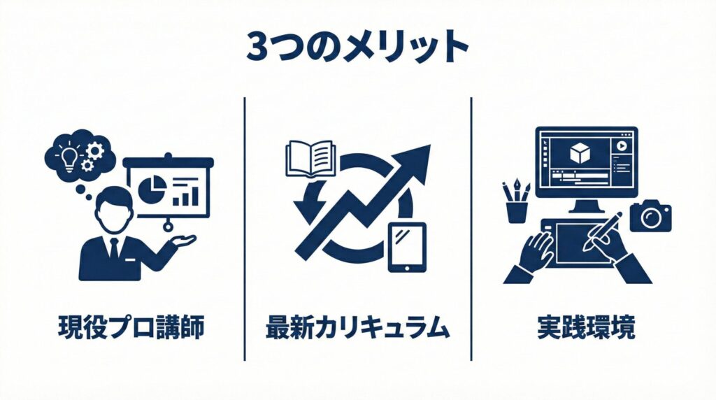 バンタンは、学歴や学割といったメリットを捨ててでも、「今、業界で使われている最新技術」を「現役のプロから直接教わる」ことに特化しています。