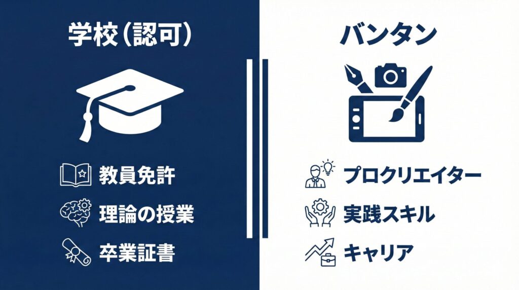 この記事では、なぜバンタンが専門学校という枠組みを選ばなかったのか、そして「無認可校」であることによって生徒にどんなメリット・デメリットがあるのかを分かりやすく解説します。