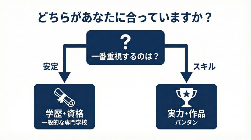 つまり、「安定と学歴の専門学校」か、「実践と自由のバンタン」か。