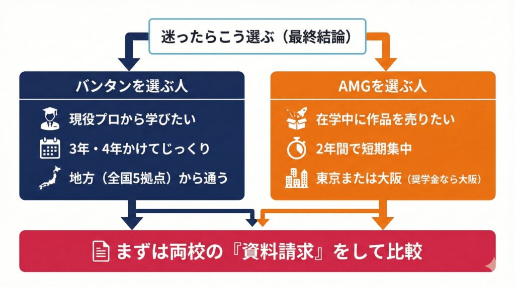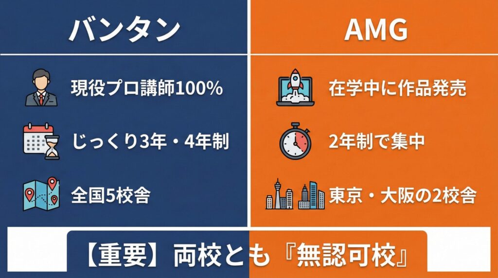 講師の質ならバンタン、作品リリース経験ならAMG。どっちを重視するかで選ぼう