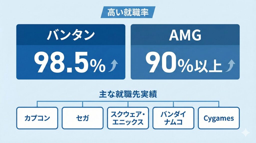 就職率だけ見ればバンタン(98.5%)がやや上ですが、大きな差はありません。どちらを選んでも、本気で取り組めばゲーム業界への就職は十分可能です。